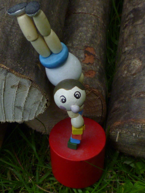 “What a hullaballoo you mean” said another voice. A cheerful acrobat emerged from under the log and stood on her hands on some bricks with her legs waving in the air.