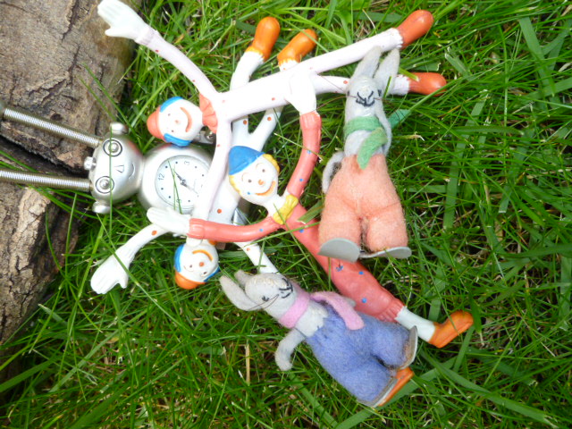 So the two of them set off and before long they could hear the sounds of the crazy party and when they peered through the long grass they saw the clowns, the rabbits and the robot lying in a silly,giggling heap.