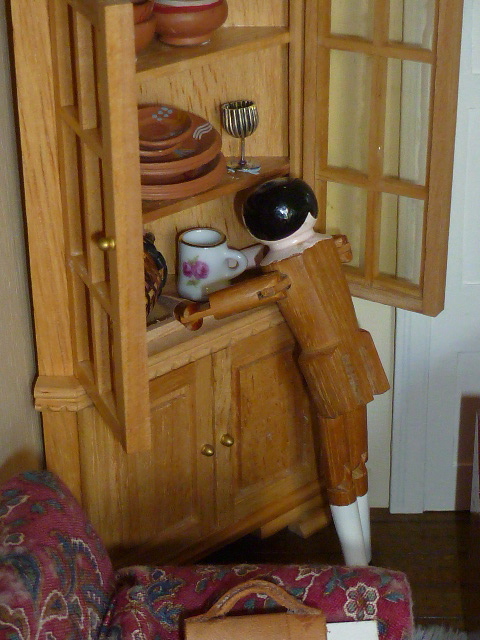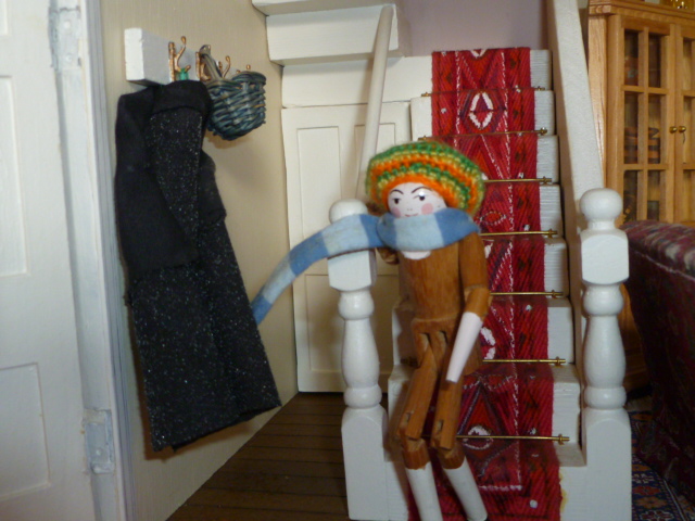 In went her wooden arms and they rummaged around but all they found were jugs and mugs and plates. Crockery is all well and good but notes on scraps of paper are better! Feeling a little disappointed Doll Splinter went into the hall where there were clothes hanging on pegs. She found a hat and a scarf and tried them on.