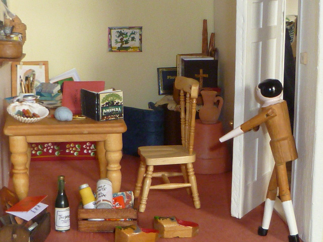Doll Splinter took off the hat and scarf and went across the hall into another room. This looked interesting! It was cluttered!