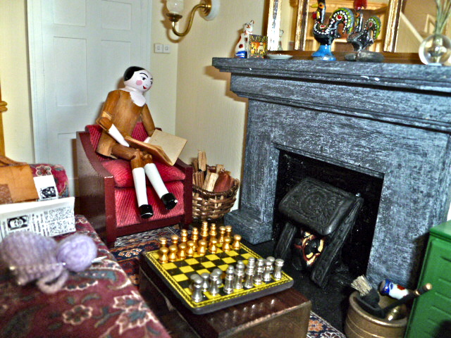Every room in the house felt like a story. The sitting room had a comfortable sofa and arm chairs,there were books, newspapers and magazines scattered about.It looked cosy and seemed to speak of quiet evenings, playing chess perhaps or knitting warm jumpers, the needles clicking softly. There was no television and Doll Splinter liked that.It probably meant that the people could amuse themselves or that they were happy with their own thoughts. She sat in a red arm chair and warmed her feet by the fire. Then, not wanting to scorch her feet (which can happen if you are wooden and get overheated), she moved to the sofa, intending to relax for a while.