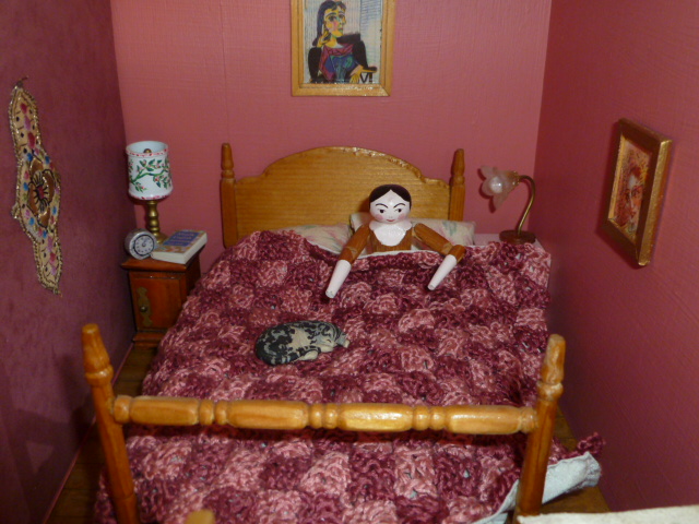 Feeling a little unnerved Doll Splinter ran into the bedroom on the other side of the landing and there she settled down in a big bed to consider things. The cat joined her and curled up and slept but Doll Splinter could not sleep.
