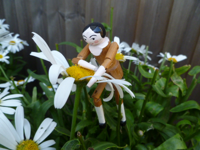 Doll Splinter is feeling somewhat melancholy. She is not sure why. Perhaps she is still feeling a bit like a teenager or maybe it is because September is coming. Whatever the reason she is spending the very last day of August sitting among the leaves and flowers. The sun today is hot and down at the bottom of the garden huge apples are thundering dangerously to the ground. It is safer where she is, in a flowerpot, climbing among the daisies.