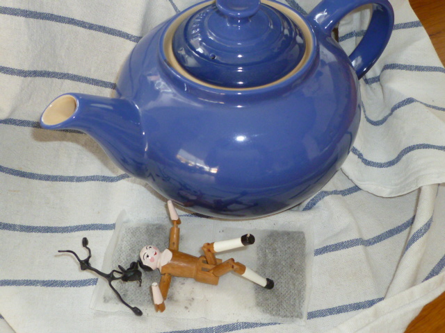 Down below, Egg O yells that tea bags are even more completely wrong. And he swings his legs in an insolent manner.