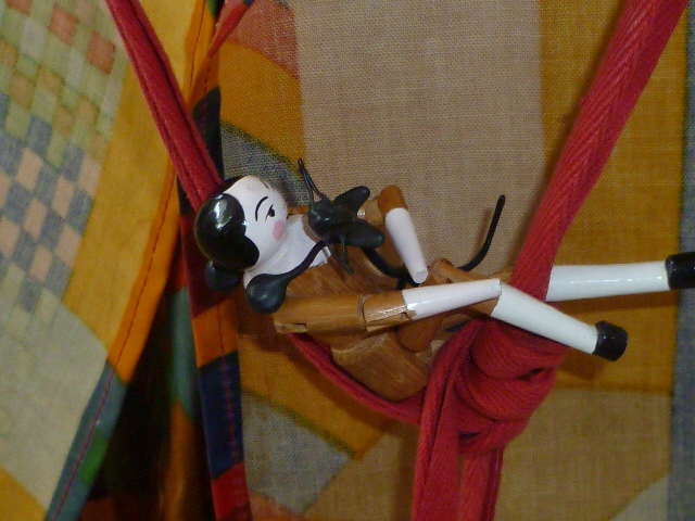There is a rope hanging down that they have to climb. Up goes Doll Splinter with the Spindly Cat clinging on.It is a very long way and every now and then they pause and the cat purrs.