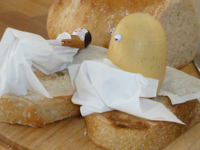 And here are Doll Splinter and Egg O lounging on lightly toasted slices of sour dough bread. Their heads are resting on soft pillowy chamomile tea bags. Their coverlets are pieces of feathery white tissue.