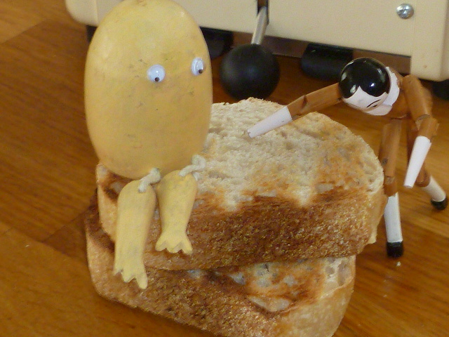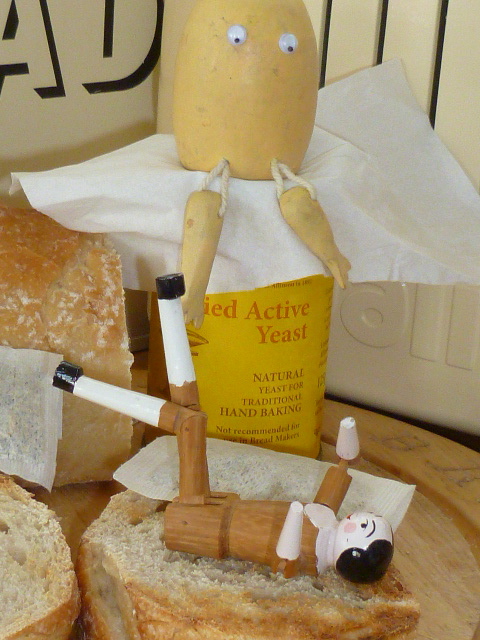 “The important thing in a mattress,” he says, “is springiness. Now with your bought yeast the rise is too fast and can only lead to eventual hardness and crumbs of discomfort in the nether regions whereas with this-” (and he thumped the toast with both hands to demonstrate) ” you get bounce and satisfaction.”