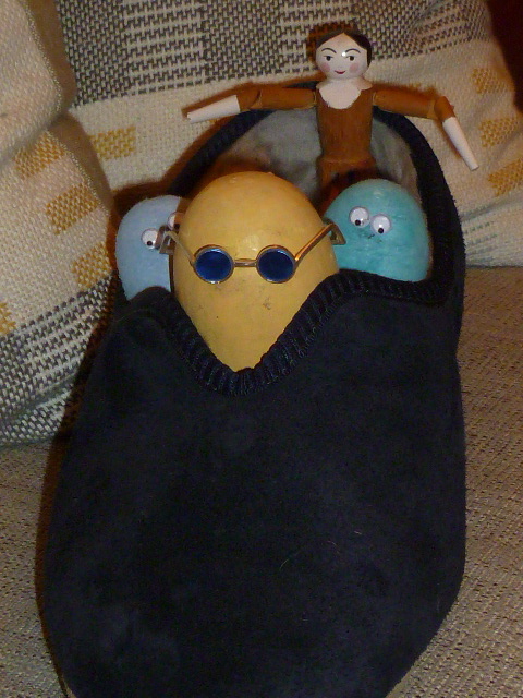 They all climb into the carpet slipper car and away they go but they are going much too fast! Egg O is a very reckless driver and he swerves wildly round a corner. He is ignoring the road signs! The cousins are screaming and jumping.