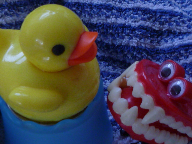 Meanwhile the chattering teeth are telling Debbie the Lifeguard that they would never behave so badly. They are making a good impression.